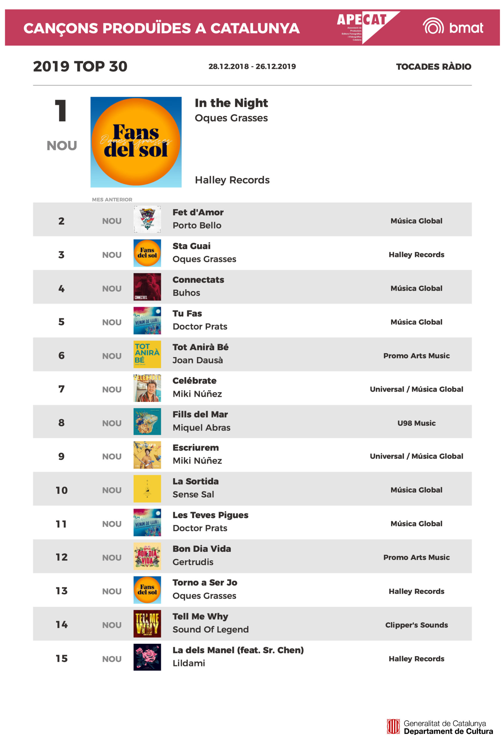 APECAT de les cançons en català més radiades. Al llarg de 2019 han estat “Número 1” artistes com Doctor Prats (gener, febrer i març), Rosalia (agost, setembre i octubre), Oques Grasses (juny i juliol), Miki Núñez (novembre i desembre), Joan Dausà (abril) i Buhos (maig).